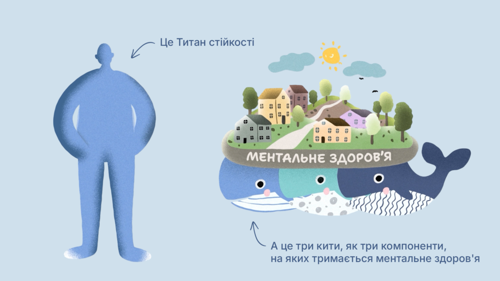 Перший — обрати персонажа, який втілює стійкість як внутрішню силу, доступну кожному. Ми шукали образ, який би не мав чітко визначеного гендеру чи віку — щоби показати: психологічну стійкість може розвивати кожна людина. Так з’явився титан-стійкості.