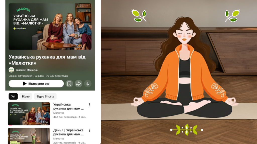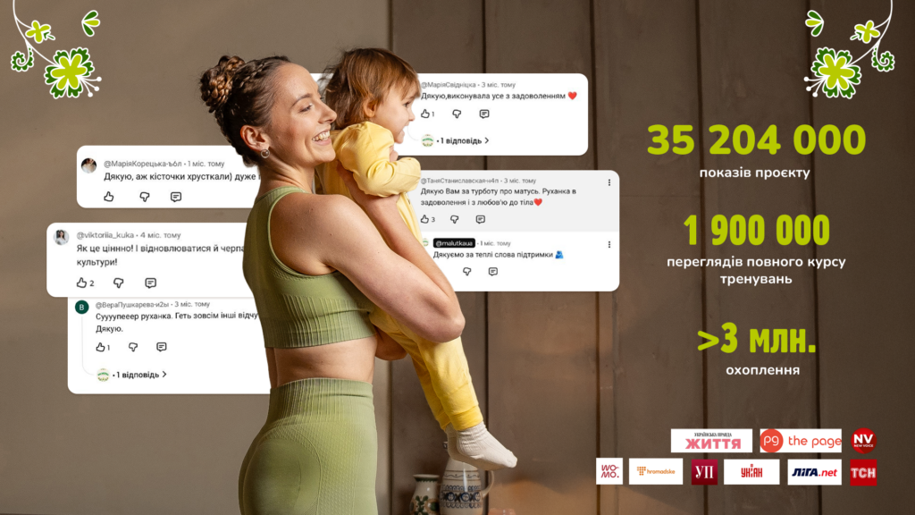 Саме тому в підсумку отримали 35 204 000 показів проєкту, 1 900 000 переглядів повного курсу тренувань, понад 3 мільйони охоплення та схвальні відгуки від матусь, які вже спробували «Українську руханку для мам від “Малютки”».